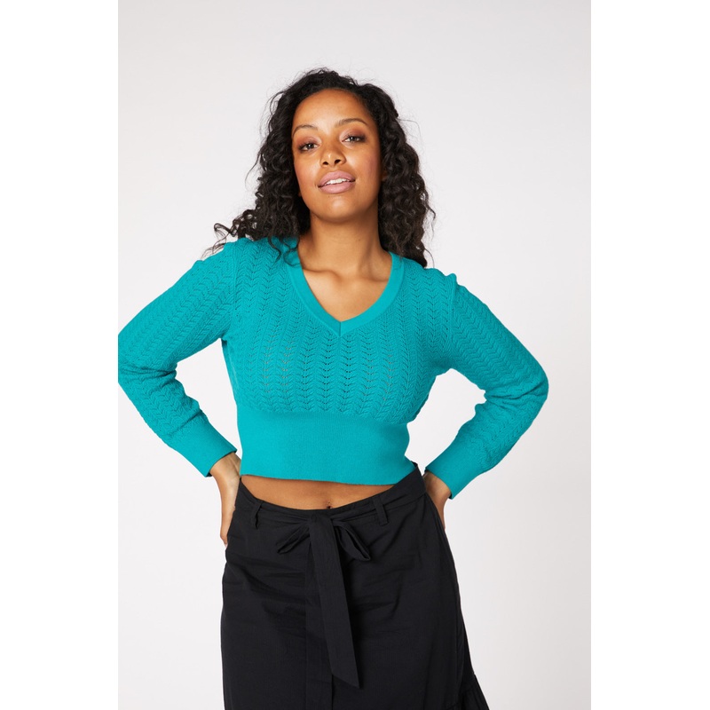 Long sleeve cotton v-neck pointelle knit sweater- effortlessly sweet sweater to coordinate with all your outfits- 100% cotton yarn - light weight knit sweater with all over pointelle knit design- v-neck line - finishing at the waist, semi fitted sleeve wit