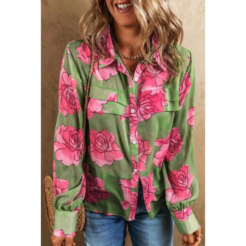 Blossom in style with our Rosy Flower Collared Neck Long Sleeve Shirt! This delightful piece radiates charm with its all-over floral print, adding a burst of freshness to your look.