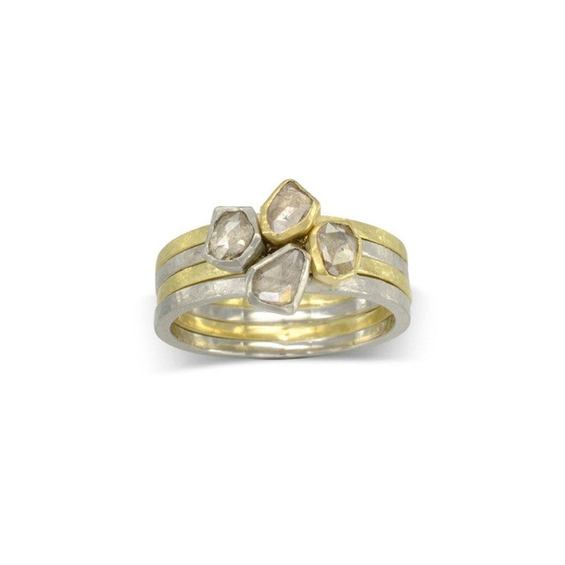 The Rough Cut Diamond Mixed Metal Stacking Ring Set is carefully made in platinum and yellow 18ct gold, featuring hand-carved settings in two contrasting colours of metal and set with rose-cut diamonds.
