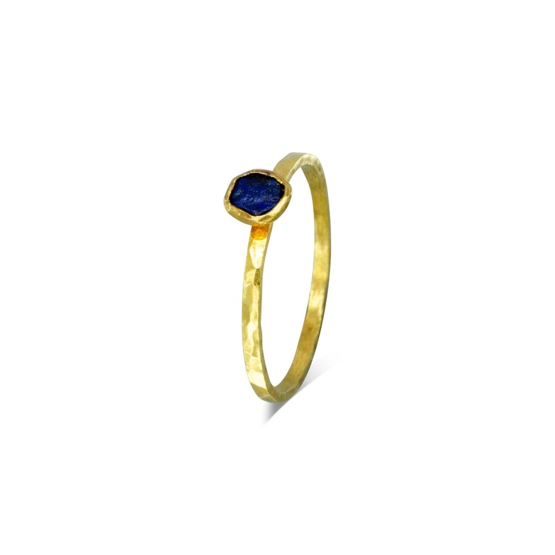 The Rough Cut Lapis Lazuli Gold Stacking Ring features a rough hammered finish that provides a textural and organic element to the ring.Solid 18ct Yellow Gold: The ring is made in a solid 18ct yellow gold setting. The band is 1.2mm and square.Rough Cut Lap