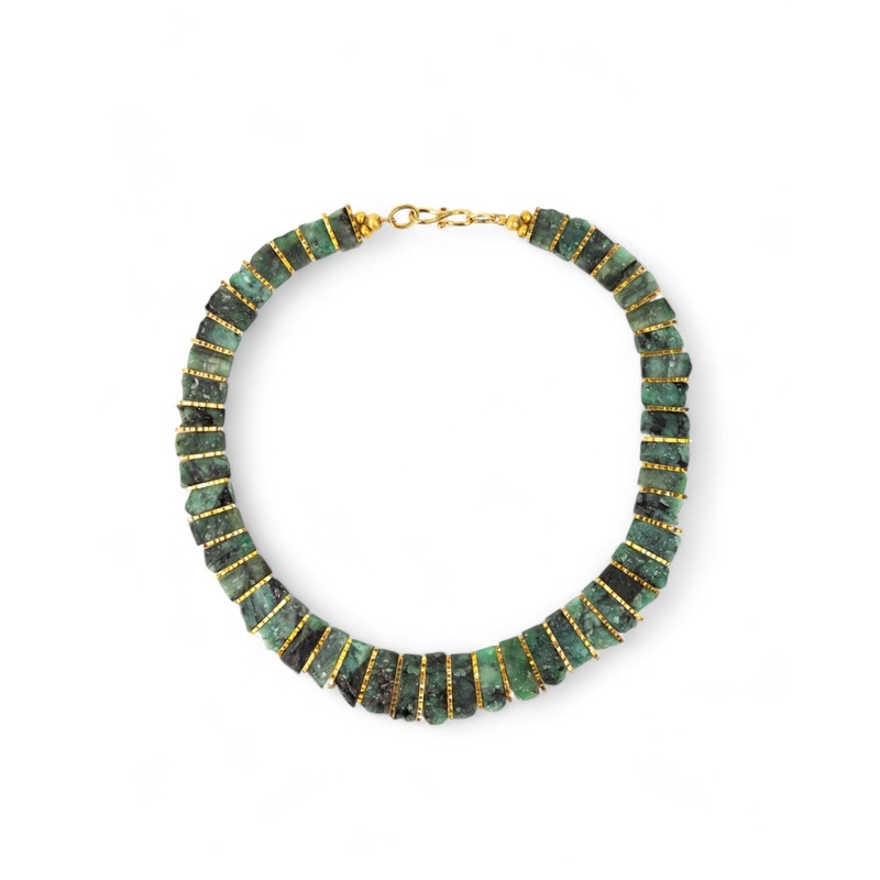 The Rough Emerald Tab Necklace combines the raw beauty of Brazilian emeralds in black, brilliant green, and pale green hues, creating a colour palette that captures the essence of nature's finest gemstones.Brazilian Emeralds: Sourced from the heart of Braz
