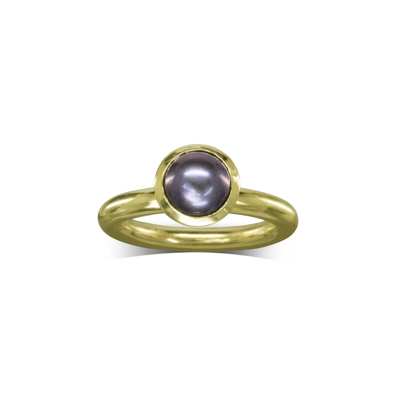 The Round Black Pearl Gold Ring has been designed to showcase the classic beauty of a round pearl. This elegant ring features an “acorn” cup setting.