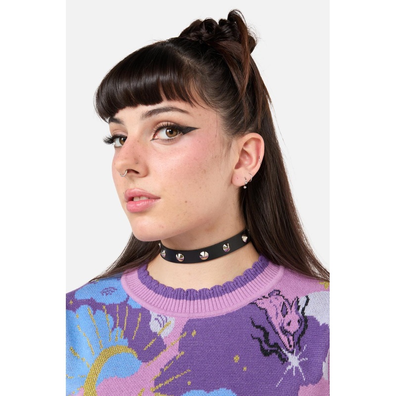 Round Stud Choker – A simple, classic, stylish accessory – Black vegan leather – All over roung studs – Silver toned hardware – Buckle fastening – Comes in sizes S, M and L