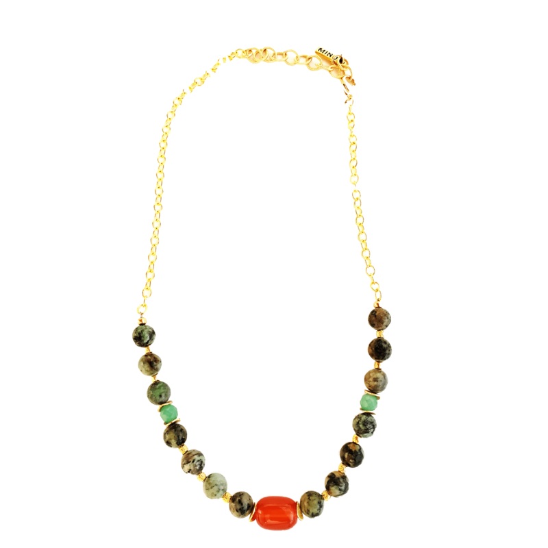 Beautiful rustic look. Simple style with African turquoise, carnelian and gold tone accents.Approx. length 17" + 1" extender. Lobster clasp.