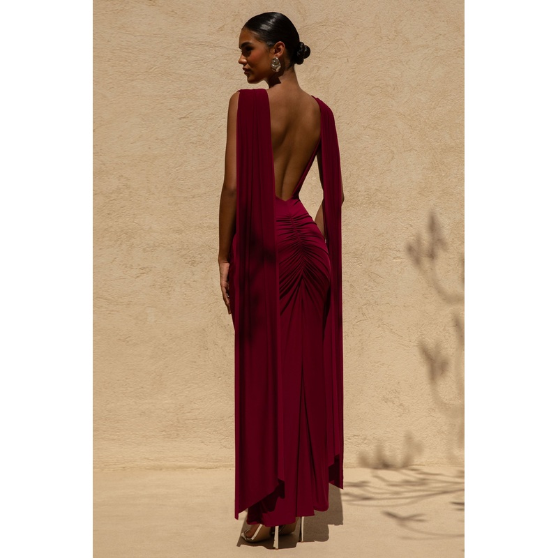 From wedding guest looks to dinner date styles, Saige wins them all, every time, thanks to her elegant back cape detailing and romantic ruching design. She is the perfect maxi for creating an everlasting impression when entering the room, and she knows it. Crafted from a rich shade of burgundy in our premium stretch jersey material, you can spend the evening in comfort and confidence knowing you’re figure will be snatched and sculpted from every angle, all night long.