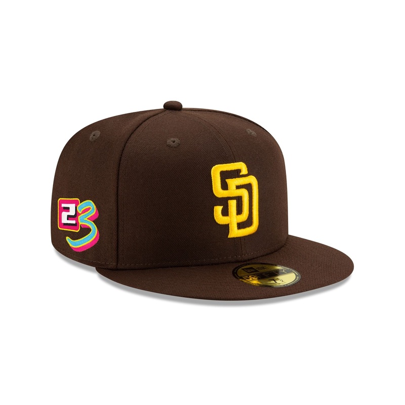The San Diego Padres Player's Weekend Tats 59FIFTY Fitted Cap features an embroidered Padres logo at the front panels with a matching MLB Batterman logo at the rear and the player's number at the right-wear side.
