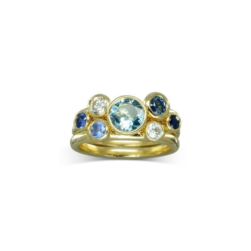 The Sapphire and Aquamarine 9ct Gold Stacking Ringfeaturesteal and blue sapphires surrounding a central aquamarine, that captures the essence of tranquillity and the colours of the sea.Premium Materials: Choose to have yourSapphire and Aquamarine 9ct Gold