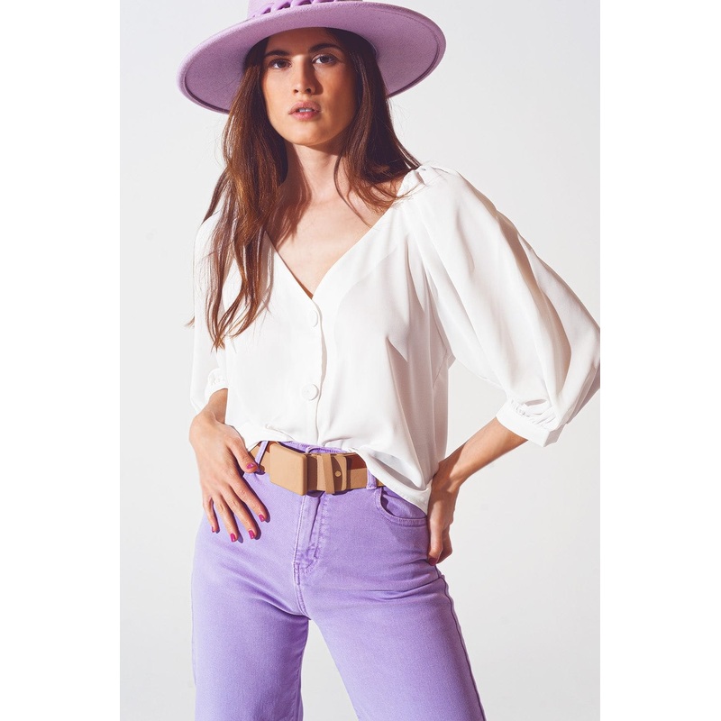Introducing our Satin Button Through Shirt in Cream, the perfect addition to your summer wardrobe! This shirt features a cropped length that pairs perfectly with high-waisted bottoms, a romantic V-neck neckline, and ruched volume sleeves that add a touch of feminine elegance. The standard fit ensures a comfortable and flattering silhouette, while the ruched details add a touch of texture to the lightweight woven fabric.