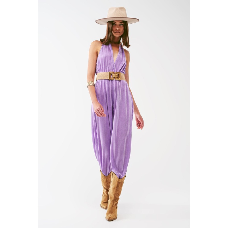 Introducing our Satin Halter Neck Pleated Maxi Jumpsuit in Lilac, a stunning and elegant choice for your next party or special occasion. This jumpsuit exudes grace and style with its exquisite design and luxurious satin fabric.