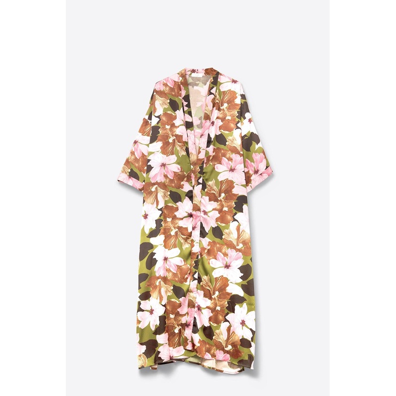 Elegant and expressive, this satin tropical floral kimono in olive green brings vibrant artistry to your wardrobe. The flowing silhouette features wide sleeves and a relaxed drape, while the oversized floral printbursting with pink and red bloomscreates a