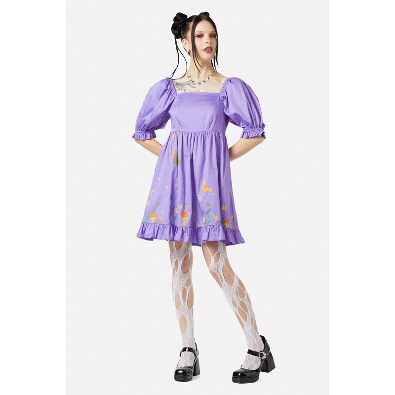 Boarder Print Dress -Features Scenic Nights’ Boarder Print -Puffy Elasticated Sleeves -Fitted Bodice -Flared Skirt With Hem Frill Trim -Zipper Opening -Made From Cotton Sateen -Available In Lilac & Black