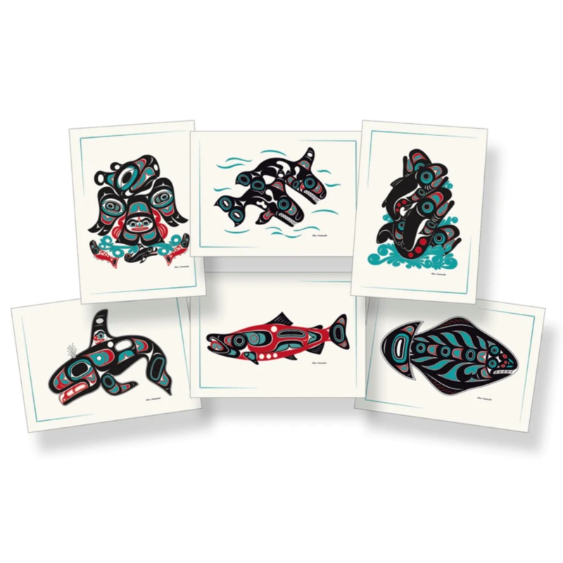 Tlingit formline designs by Israel ShotridgeCollection of Six 5 X 7 Art Cards includeThunderbird by the SeaOrcasSalmonKiller WhaleNorthwest SalmonHalibut