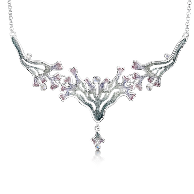 This Sea Moss 3-part dress necklace features an organic seaweed design, beautifully highlighted in Sheila’s Mill Sands enamel, and enhanced with moonstones. A small enamelled droplet hangs from the bottom. The largest section of this necklace measures approximately 53mm by 56mm.