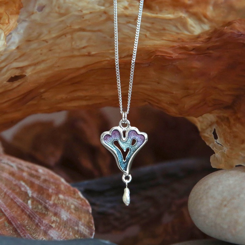 This Sea Moss pendant features a small heart-shaped seaweed design, beautifully highlighted in Sheila’s Mill Sands enamel, and enhanced with a long freshwater rice pearl. The pendant design measures approximately 18mm by 18mm with a 30mm drop, and hangs elegantly from a silver curb chain.