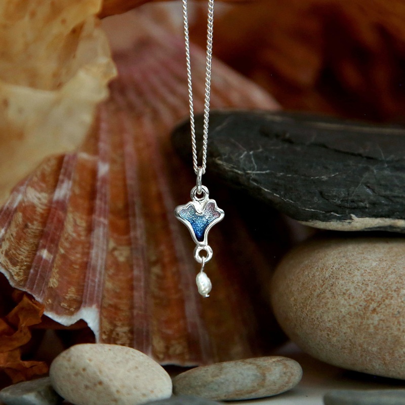 This Sea Moss pendant features a petite heart-shaped seaweed design, beautifully highlighted in Sheila’s Sea Blue enamel, and enhanced with a long freshwater rice pearl. The pendant design measures approximately 9mm by 9mm with a 19mm drop, and hangs elegantly from a silver curb chain.