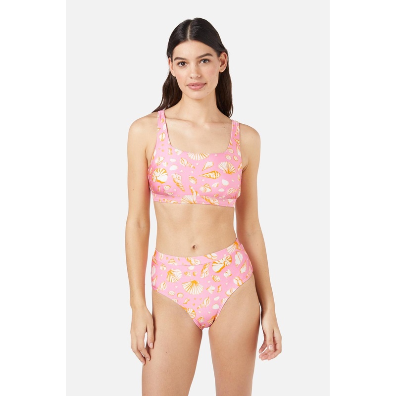 Pink seashell printed bikini top, a cute & comfy square neck swim style perfect for beach or poolside days - square neck- fixed adjustable straps- removable cups- back rear clasp- nylon elastane blend swim fabric with lining- available in pinkProduct Code: