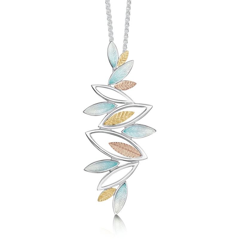 This stunning Seasons dress pendant necklace in sterling silver features a variety of beautiful silver leaf shapes, enhanced with solid 9ct yellow and rose gold leaves, and 'Winter' enamel. The design is approximately 23mm by 59mm and hangs from a silver w