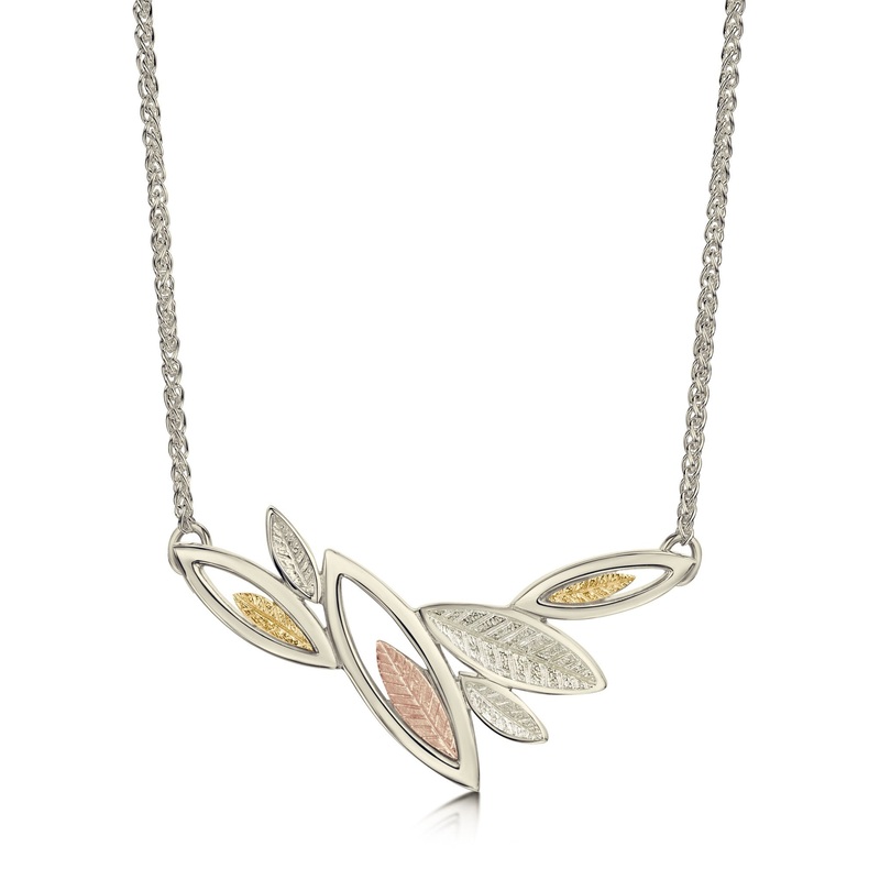 This Seasons necklace features six 9ct white gold leaves, three of which are enhanced with 9ct yellow and rose gold. The design is approximately 50mm by 25mm and hangs from a golden wheat chain.Seasons is a celebration of happy times and special moments as