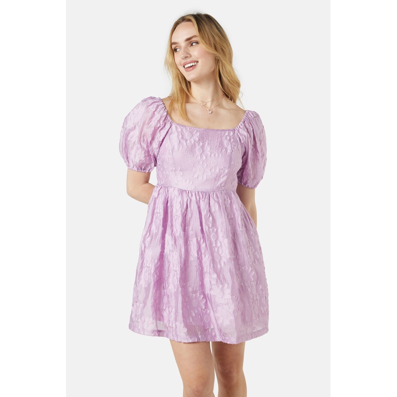 Floral organza mini dress- a romantic mini dress with voluminous sleeves- fitted waist with a gathered skirt- finishes above the knee- elastic over the shoulders- back zip closure- crafted from a organza fabric with textured flowers- available in lilacProd