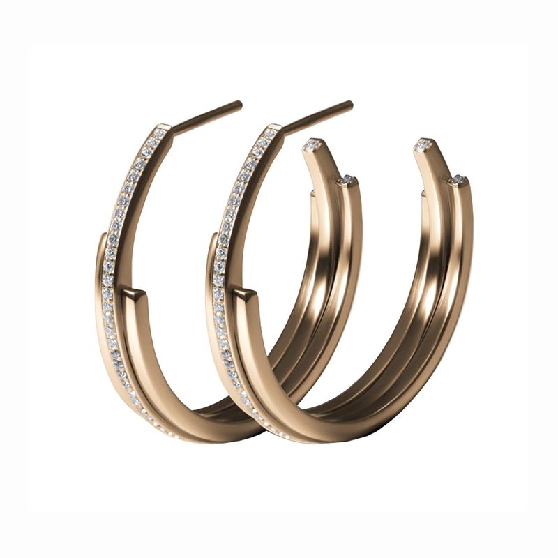 TheSequential 3 Arc Hoops aremade in Stockholm from sustainably sourced, conflict-free 18K Gold, featuring Top Wesselton VVS diamonds. These earrings are available in 4 colours: yellow gold, rose gold, raw white gold, and Swedish red gold, which is a unique colour somewherebetween rose gold and yellow gold in tone.The appearance can be adjusted by combining two or more pieces together.Part of Annette Welander’sSequential Collection.Taking lines as a point of departure, the Sequential collection is based on circumference.They act according to the principles of duplication, repetition and multiplication. Connectingat different centres with diverse arc length cuts, they create space by taking a single mass and extending it into a sequence of different forms.Each piece, according to the house signature, has a hidden diamond.