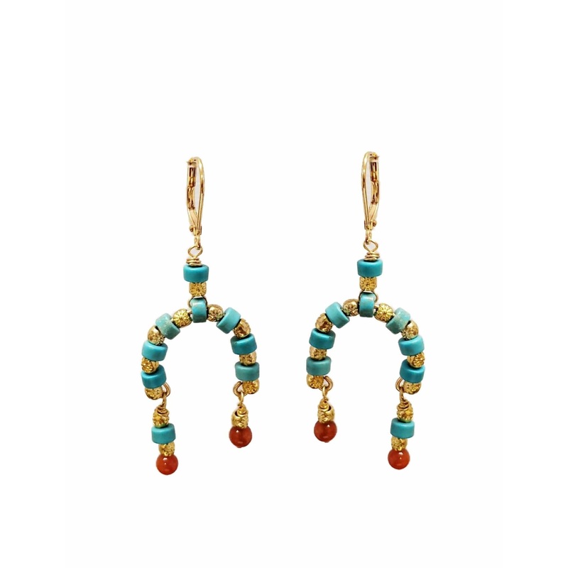 Beautiful gold earrings withturquoise and carnelian.2 inches long, pierced. Lever back.
