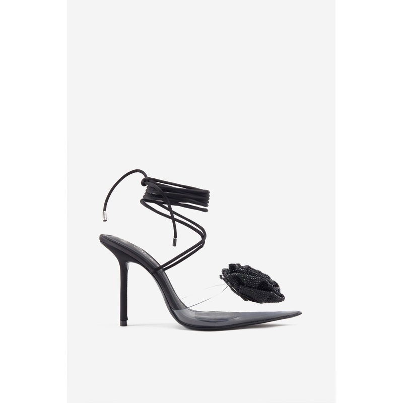 Sharpened | Black Lace-Up Clear Stiletto Heels With Diamante Flowers