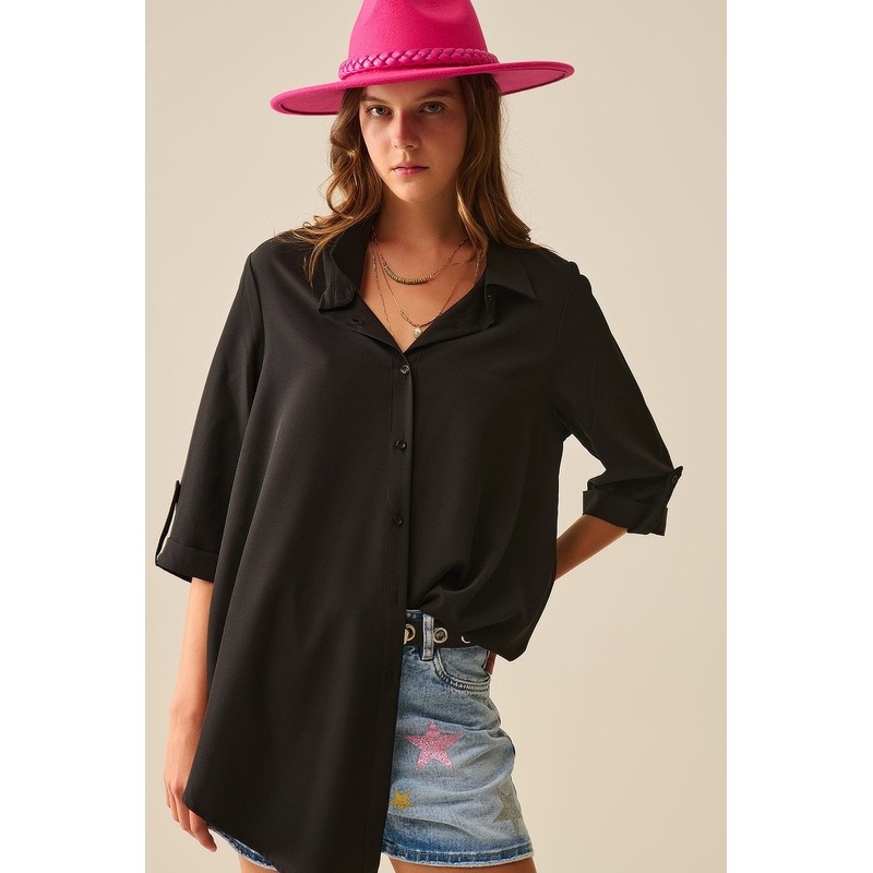 Effortlessly stylish and endlessly wearable, this black oversized shirt is crafted from an ultra-soft, feather-light fabric that feels as good as it looks. With a flowing silhouette and a relaxed drape, it features a classic polo collar and a sleek button placket that adds understated structure. The 3/4 length sleeves are gathered with buttoned cuffs for an added touch of versatility and shape, making it a perfect choice for layering through the seasons. Made from a blend of 95% polyester and 5% elastane, this piece offers breathable comfort with just a hint of stretch.