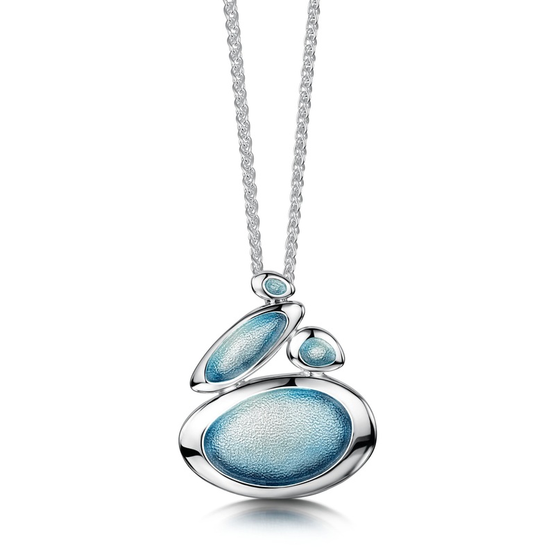 This Shoreline Pebble pendant necklace in sterling silver features a cluster of pebbles, enamelled in multiple colourways, reflecting the colours found on beaches in Orkney. The piece hangs elegantly from a sterling silver wheat chain and measures approximately 26mm by 31mm.