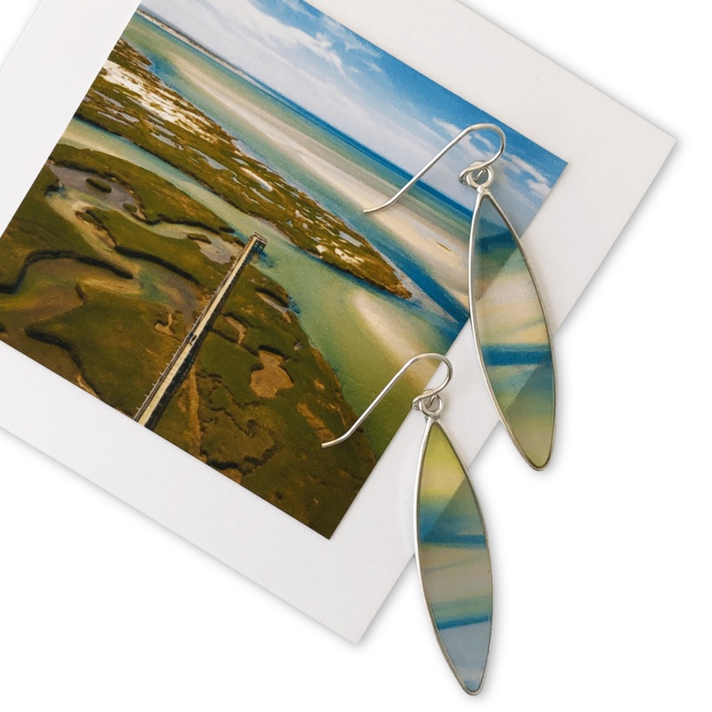 The wetlands of the Massachusetts coast are a place of quiet beauty. In these Shoreline Surf Earrings, you can wear a piece of that natural wonders. The aerial photograph printed on each earring captures the delicate ecosystem in all its glory. These earrings will transport you to this tranquil place.