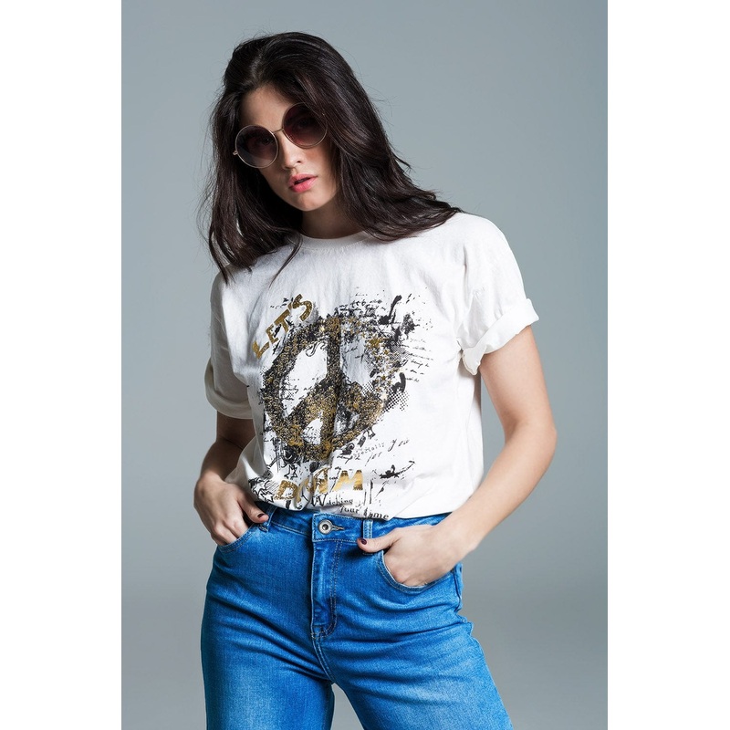 Introducing our Short Sleeve T-Shirt with a Graphic Peace Sign Design a symbol of peace and style that effortlessly elevates your spring wardrobe. This cream-colored t-shirt is not only a fashion statement but also a representation of harmony.