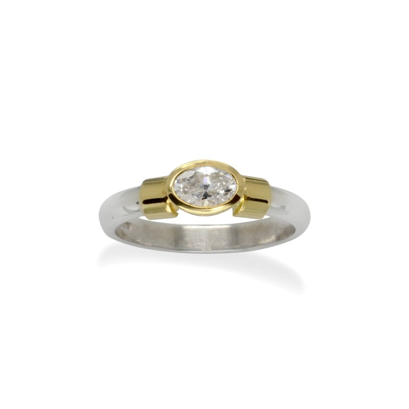 The Shoulder Mixed Metal Oval Diamond Ring is handmade in platinum and features an 18ct yellow gold setting and shoulders that add warmth and contrast to the modern design.Central Brilliance:Thering pictured features an oval diamond approximately 0.4ct (6x