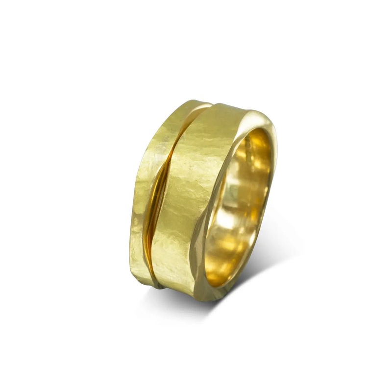 The Side Hammered Double Yellow Gold Ring (Wide)is visually dynamic and unforgettable.Dual-Band Design: This ring is 12mm wide and is made from a 4mm and an 8mm gold band. It measures 1.8mm in thickness and has a rough hammered finish to the top, with a po