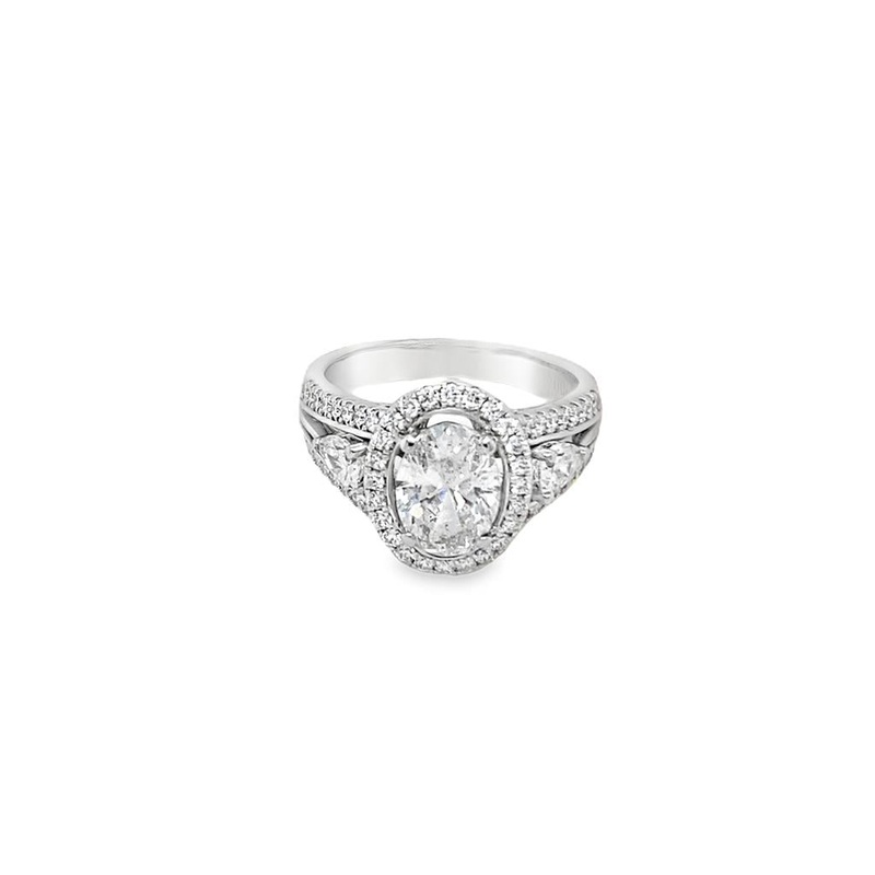18 Karat White Gold Simon G Oval Halo Engagement Ring Estate Jewelry Size 5.5 With One = 1.75Ct Oval F I1 Diamond, 2 = 0.44Tw Pear F Si2 Diamonds And 0.37 Twt Other Stones Gram Weight: 7Jewelry Type: Engagement Ring