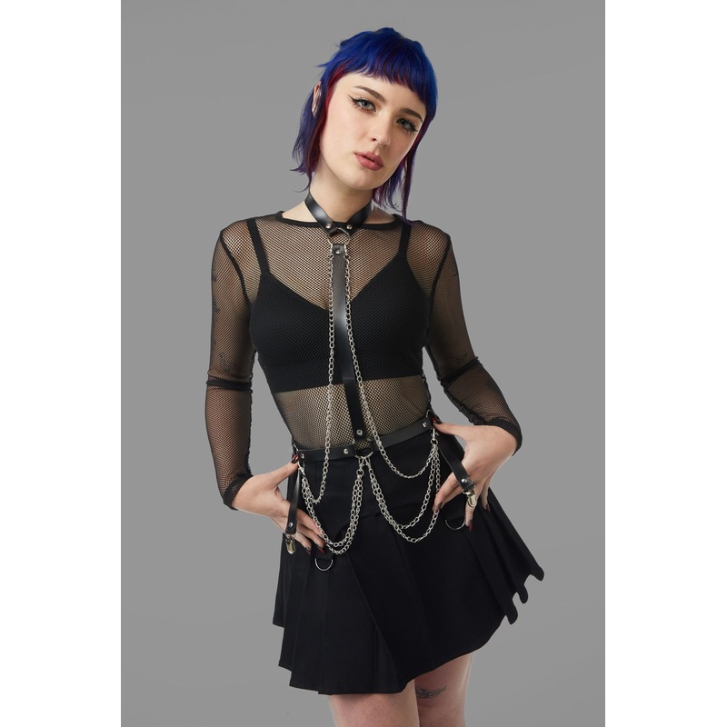 Simple Centre Strap Harness- An easy way to spice up any look- Black vegan leather- O -ring features- Removeable chains- Suspender straps- Hardware silver in colour- Comes in sizes XS, S, M and LProduct Code: BWFX013