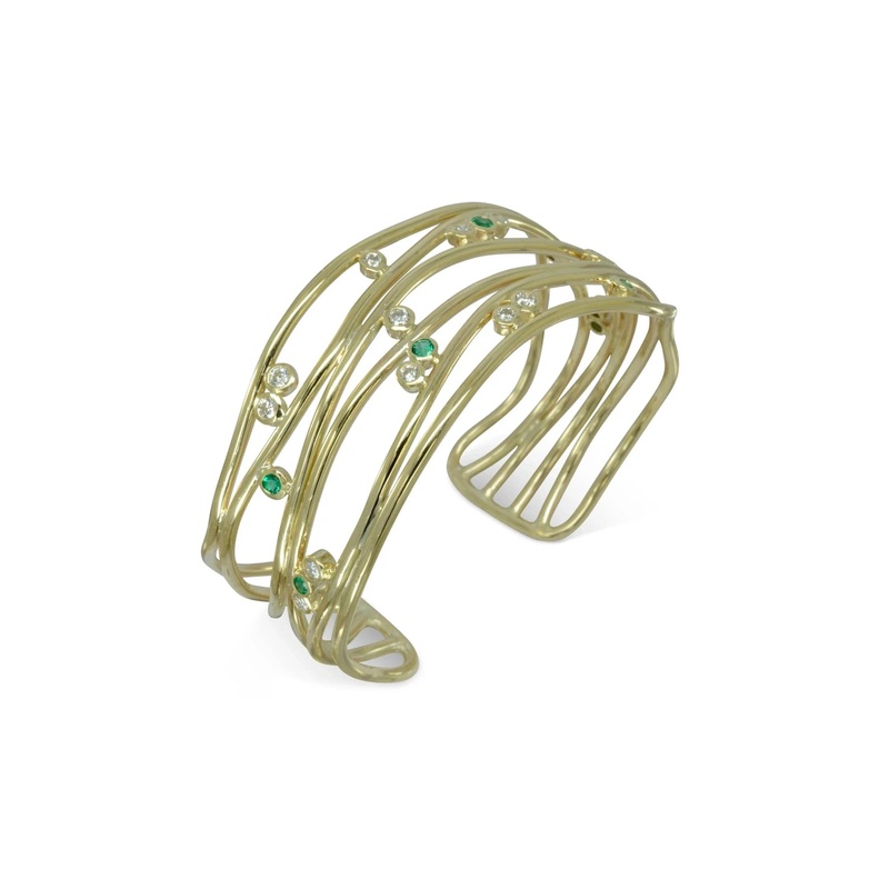 The Six Strand Solid 9ct Gold Precious Gemstone Cuff Bangle (Shallow) is formed of six waving strands of 9ct gold, arranged in a flowing water pattern. Nestled within the strands are small diamonds and coloured gemstones, delicately set in bubble settings.