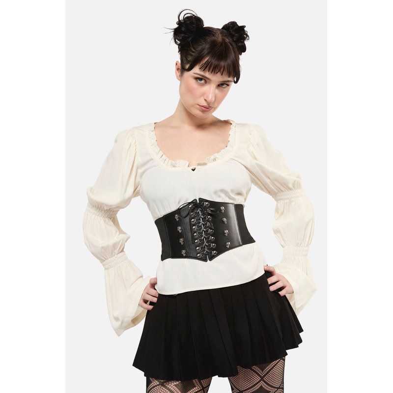 Skull Stud Corset Belt- A cool waist belt- Easy to wear, easy to style- Gothic inspired design- Embellished with skull shaped studs- Silver toned hardware- Vegan leather- Available in black- Elasticated backing- Press stud closure- Comes in sizes XS, S, M
