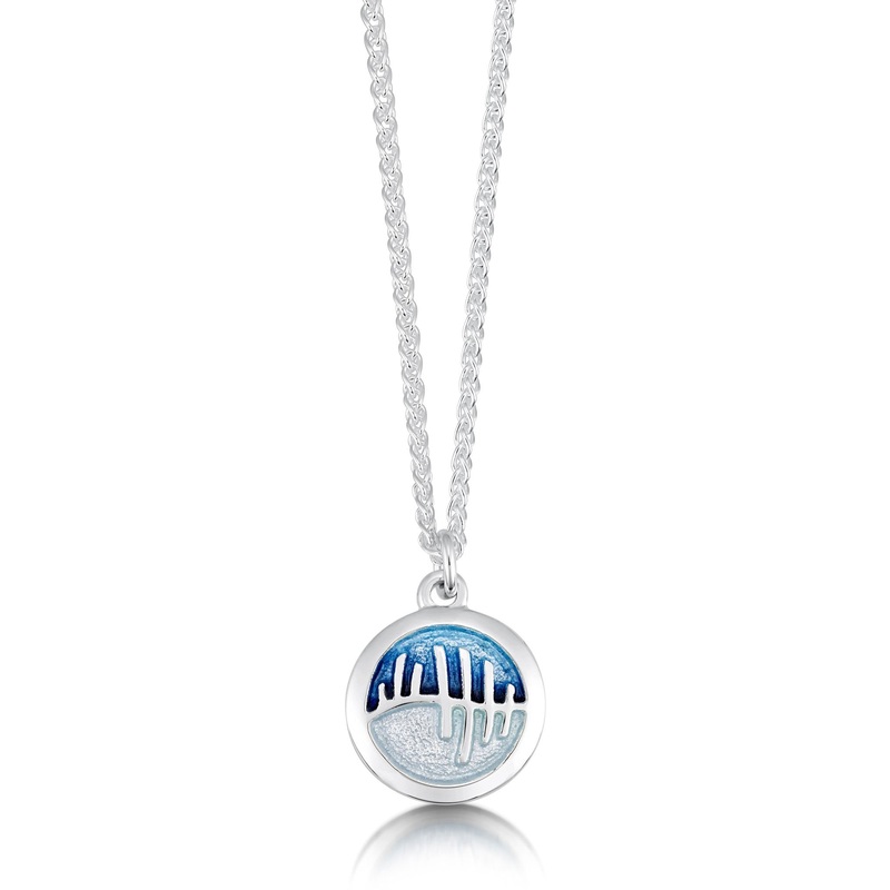 This petite Skyran pendant necklace in sterling silver features ancient Ogham script that says If. The small circular design elegantly drops from a silver chain and is hand-enamelled in our Orkney workshop.