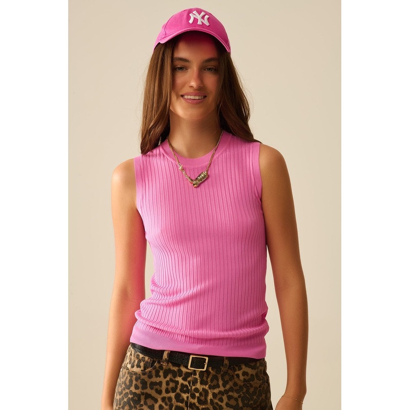Brighten up your wardrobe with this vibrant sleeveless ribbed knit top in a bold fuchsia hue, designed to bring a fun, modern edge to any outfit. The fine knit texture adds visual interest while offering a soft, comfortable feel against the skin. With its sleek bodycon fit and just the right amount of stretch, this top hugs the figure for a flattering, polished look thats perfect for layering or wearing solo.