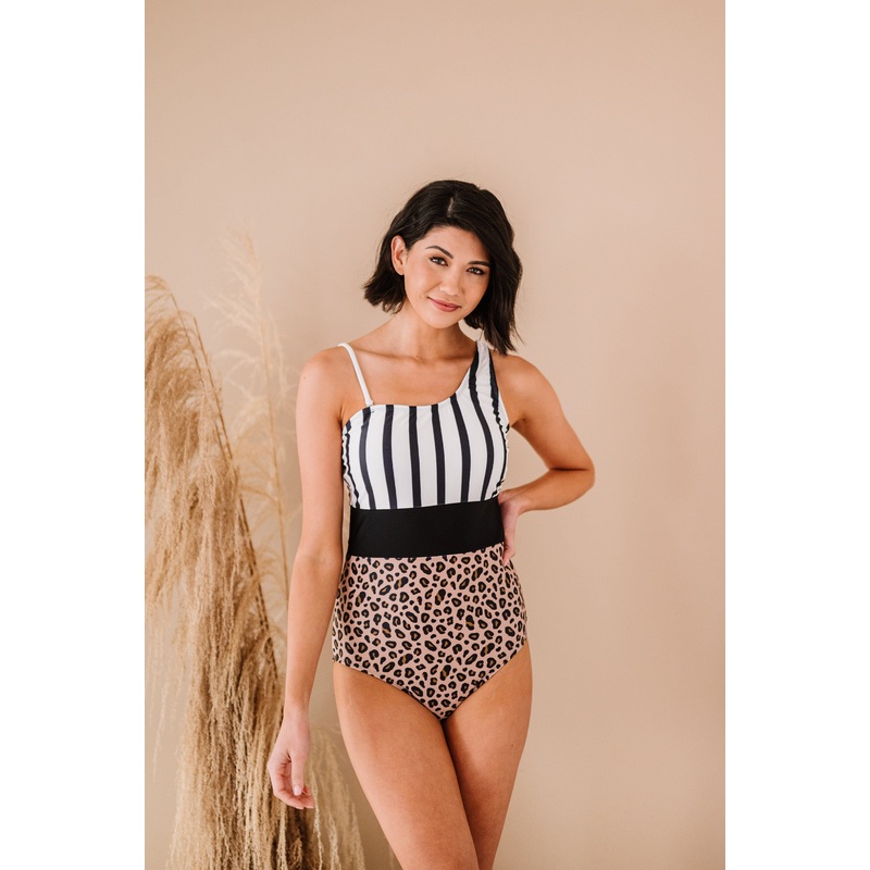 Black, stripes and leopard, OH MY! This cute one pieces is sure to put a smile on your face! With the one strap style, high waistline and black mid section, this beauty was made for you! Pair this with our black mesh cover up and black or white studded sandals and you’ll be sure to love every selfie you see in this!!