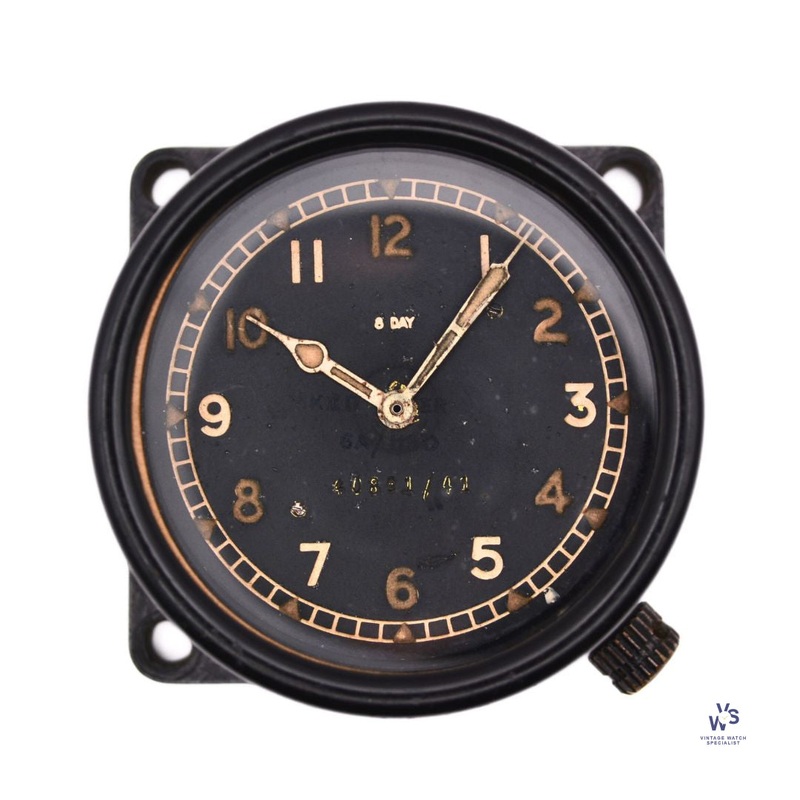 These clocks were produced and fitted to Mosquitos, Lancasters, Spitfires and Sunderlands amongst others. The dial is marked 6A – I cannot make out the numbers after this, it is also marked 40891/41 indicating manufacture in 1941 -meaning itis almost sure to have seen live-action during the war. The dial is synonymous with military timepieces, stark black dial, large Arabic numbersand cathedral hands. The lume on the alternate Arabics has aged to nice chocolate colourand the lume on the hands has also survived all this time!The time is set using the pin at the bottom right of the clock. The backplate is marked with the AM & crown stamp, denoting it as property of the MoD.