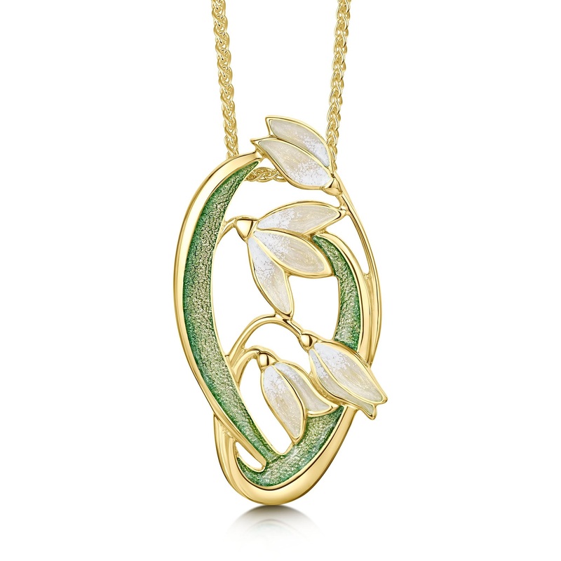 This Snowdrop Pendant Necklace in luxurious 18ct yellow gold features four delicate snowdrops framed by curving leaves and stems. The piece is hand-enamelled in Opal White in our Orkney workshop and hangs on a gold chain. The design measures approximately