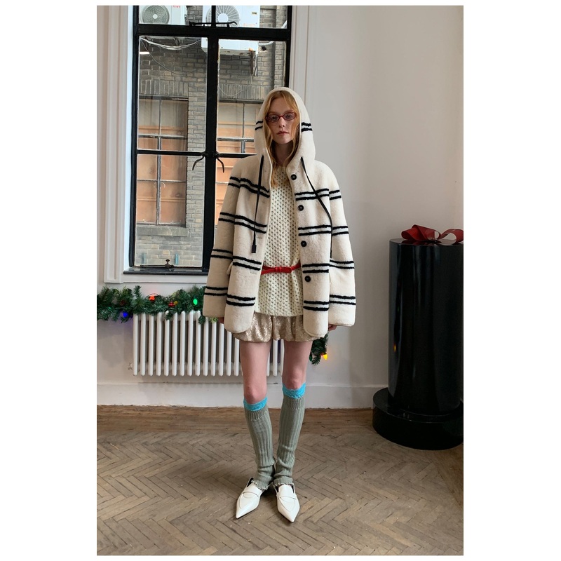Non-airbrush printing and dyeing, first of all, the same material of merino will be dyed by hand to cut into horizontal stripes, and then inlaid and sewn in the stripe of the collision because of the thickness of the fur itself, the working hours and craftsmanship have higher requirements to adhere to the handmade, to pursue the spirit of the ready-made garment of the living.