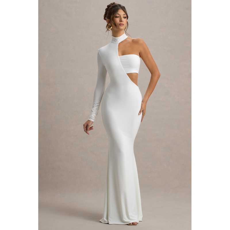 A striking design that will turn heads at any event, step into the spotlight with Socialite. Designed in a timeless white shade of our premium stretch jersey, this maxi dress is defined by its contemporary cut-out design, single long sleeve and floor-sweep
