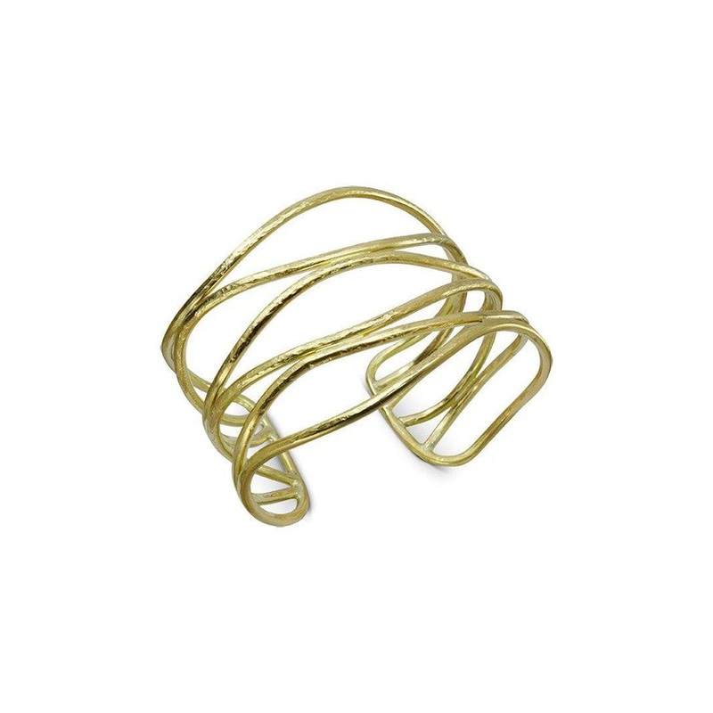 The Six Strand Rough Solid 9ct Gold Cuff Bangle ishandmade using six strands of 2mm round wire, forming a unique design. It is available in two widths: 30mm or 50mm (pictured).
