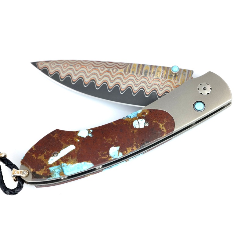 The Spearpoint Hot Lava features a light and resilient frame in aerospace grade titanium, with scales comprised of turquoise, copper, and lava rock. The blade is our signature ‘Copper Wave’ damascus with a VG-5 core; the one-hand button lock and the thumb stud are set with turquoise cabochon gemstones. A remarkable design that gives you an instrument with a full-size secure grip, and a versatile deep-belly blade, the Spearpoint epitomizes William Henrys core philosophy that superlative function deserves to be elevated to superlative art. The Hot Lava features some of the exotic materials and hand-forged metals that are the hallmark of William Henry’s collections; a distinctive personality statement to be worn and used for a lifetime.