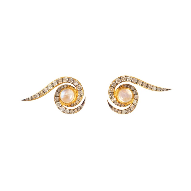 TheSpiral Earrings in Yellow Gold from the Eclipse collection are the perfect accessory to add glamour to your outfit! The earrings feature a beautiful round cabochon0.35ct Moonstoneset in an 18kt gold vermeil spiral with a GreyDiamond pave' which goes up