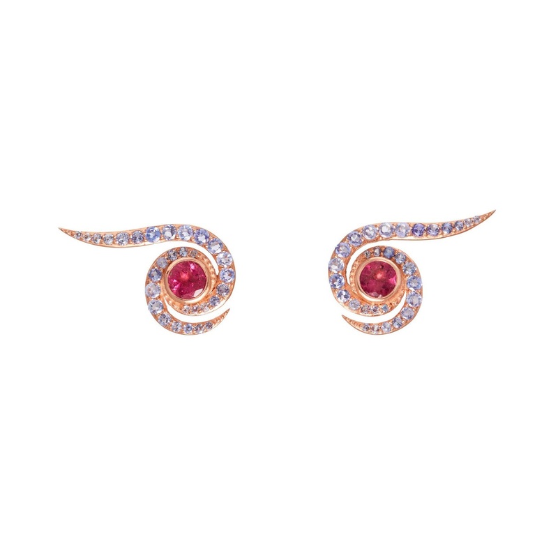 TheSpiral Earrings in Rose Goldfrom the Eclipse collection are the perfect accessory to add glamour to your outfit! The earrings feature a beautiful round faceted 0.35ct Pink Tourmaline set in an 18kt rose gold spiral with a purple Tanzanite pave' which go