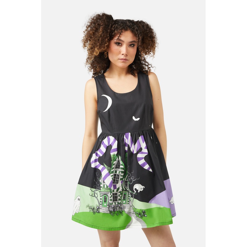 Border Print Dress-Features ‘Spooky Scene’ Border Print Design-Classic Fit & Flare Cut-Mini Dress Length-Round Neckline-Made From Cotton-Available In Multi