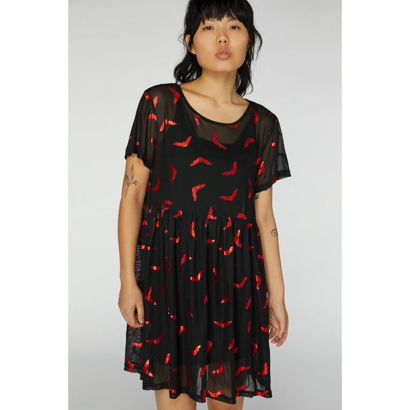 - Mesh dress with foil print detailing - Short sleeved baby doll silhouette - Round neckline - Jersey slip dress with adjustable straps - Sheer mesh fabric with all over bat print - All over silver foil print - Available in Black Product Code: BGFQ096205