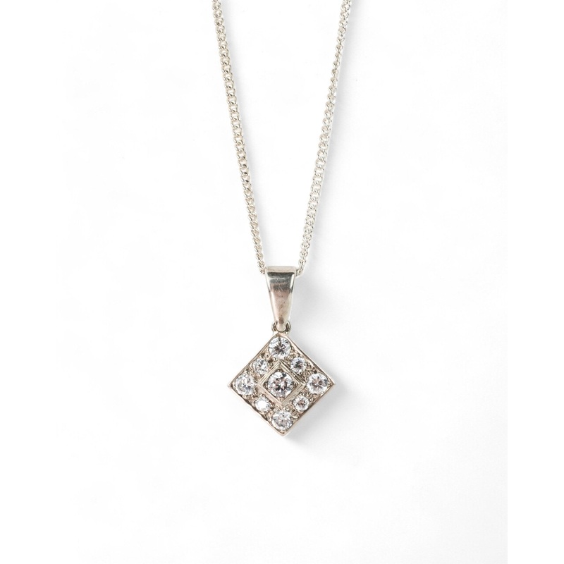 Our Square Cluster Diamond Pendant glistens beautifully in the light.18ct white gold pendant with 9 pav set RBC diamondsThis pendant includes a curb chain (pictured)Made to orderin your choice of metalOther gemstone variations are also availableSee our mat